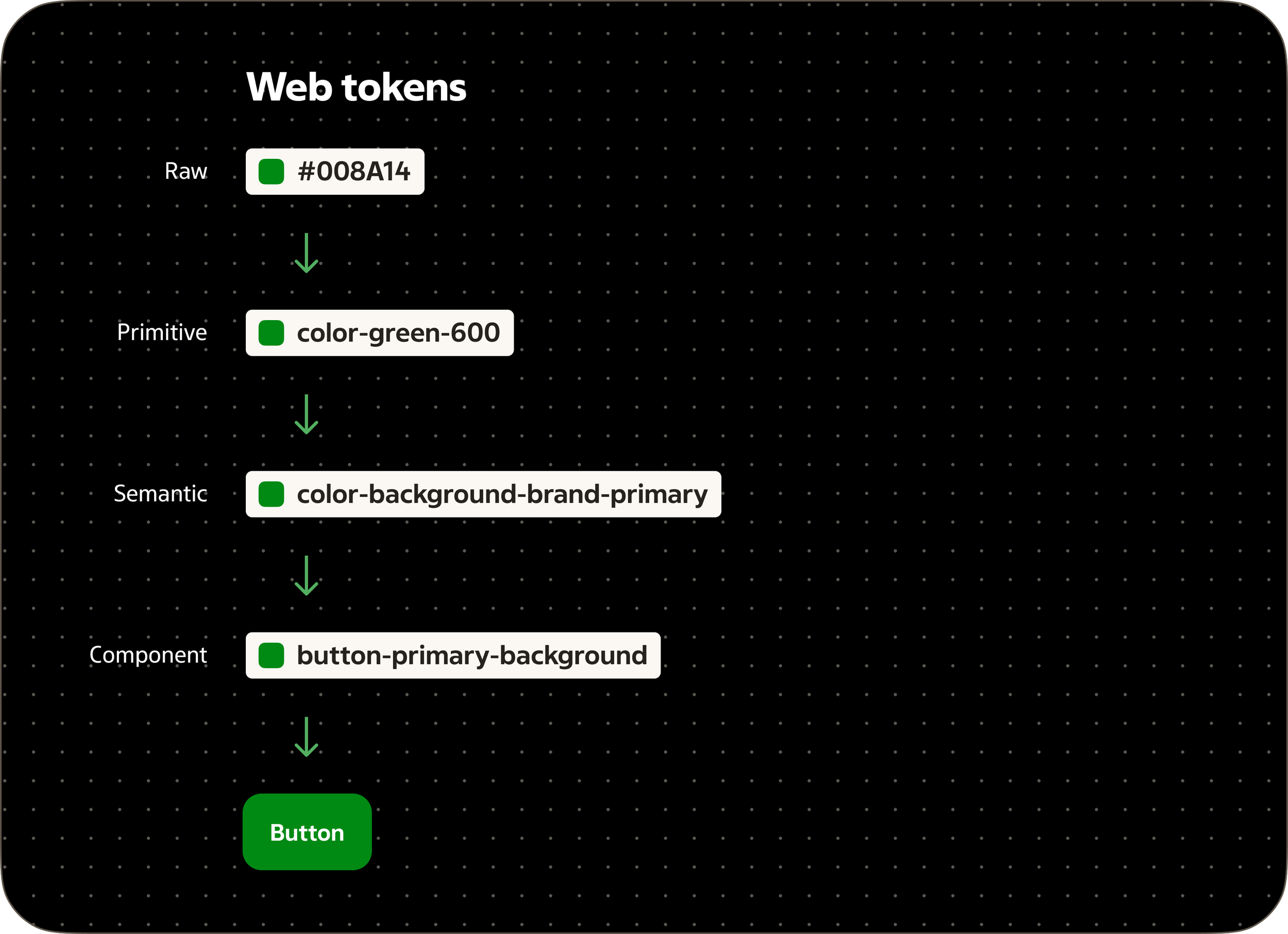 CDS runs on a primitive → semantic → component token model. A single hex value like #008A14 flows through color-green-600, becomes color-background-brand-primary, then resolves to button-primary-background. Every decision traceable. Every reskin achievable by touching one layer.