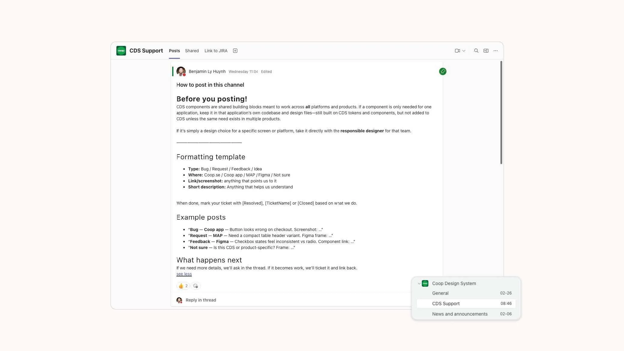 The CDS Support Teams channel gives every team a structured place to log bugs, requests, and feedback. Formatting template, Jira link integration, clear triage. It's not just a channel. It's where governance lives in practice.