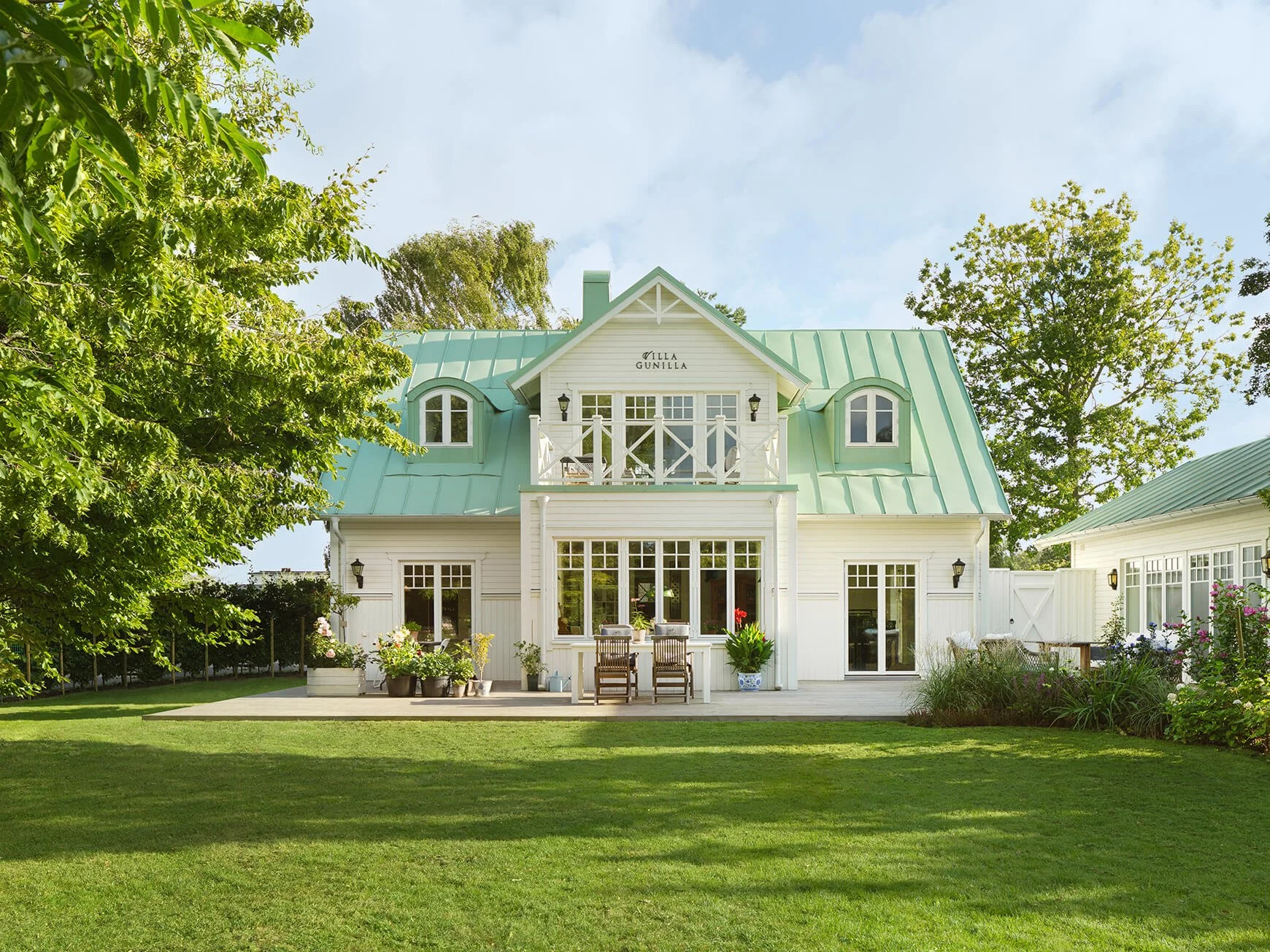 A charming two-story house with a green metal roof, white wooden exterior, large Elitfönster windows, and a small balcony, set amidst a well-manicured lawn and lush greenery.